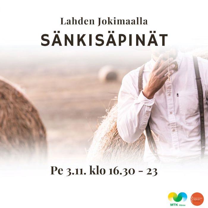 Hämeen kovimmassa maatalousalan tapahtumassa, Sänkisäpinöillä, juhlistetaan sadonkorjuun 2023 päättymistä viljelijäkollegoiden kanssa, syödään buffetpöydästä maistuva kotimainen päivällinen, tutustutaan loistavien yritysten ständeihin sekä tanssitaan livemusiikin tahdissa. Illan musiikista vastaa Kyösti Mäkimattila ja Varjokuva.