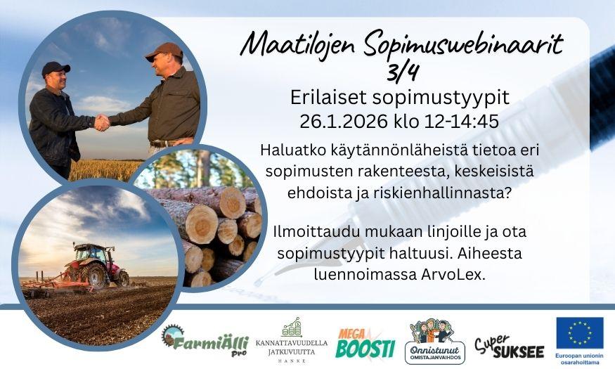 Maatilojen Sopimuswebinaarisarjan kolmas osa järjestetään 26.1.2026 klo 12-14:45.
