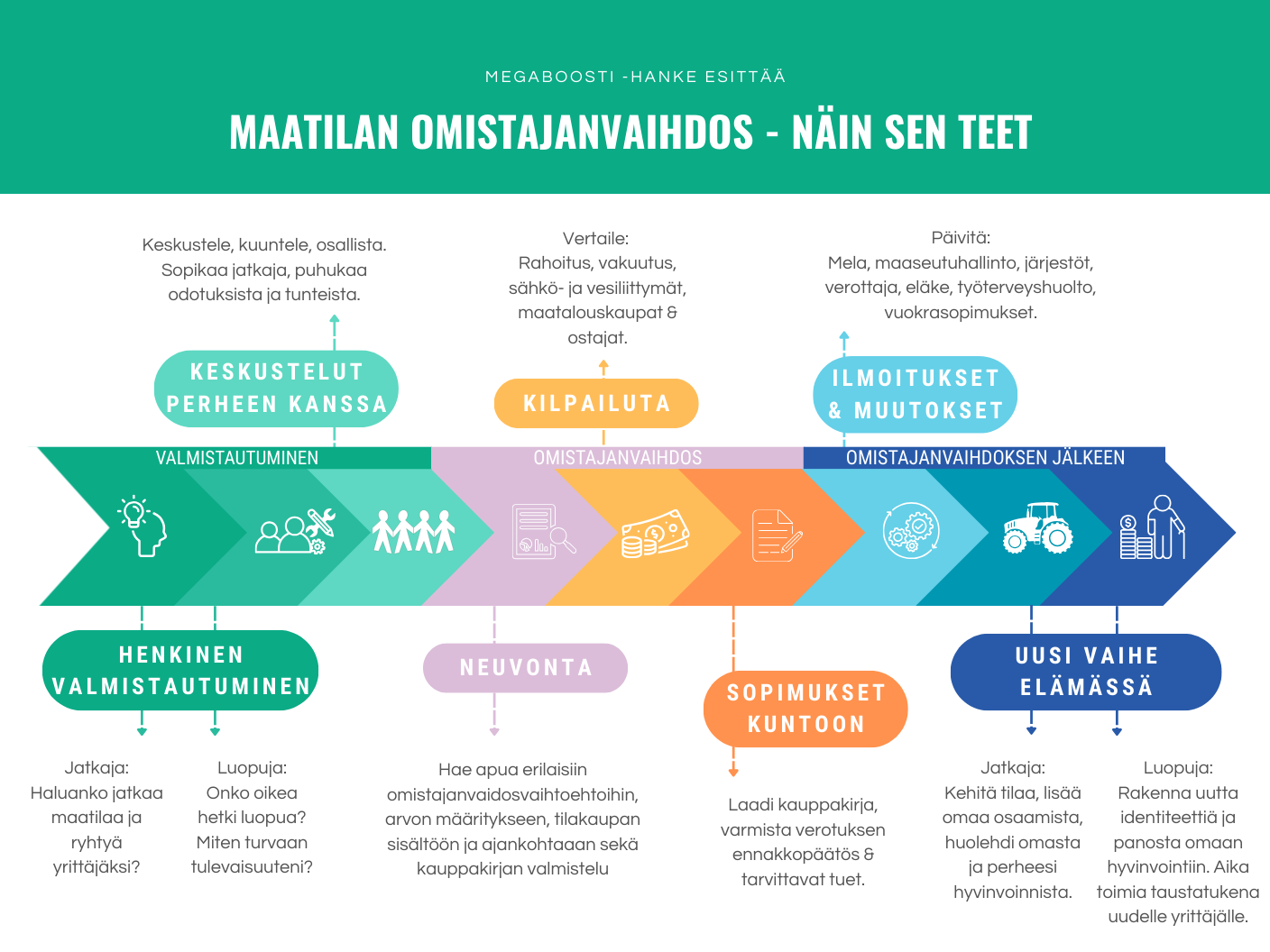 Valmistautuminen kannattaa aloittaa ajoissa, 5–10 vuotta ennen suunniteltua omistajanvaihdosta ei välttämättä ole liian pitkä aika, mutta liian hätäisesti läpiviety prosessi voi helpommin epäonnistua ja synnyttää ongelmia myös ihmissuhteisiin.